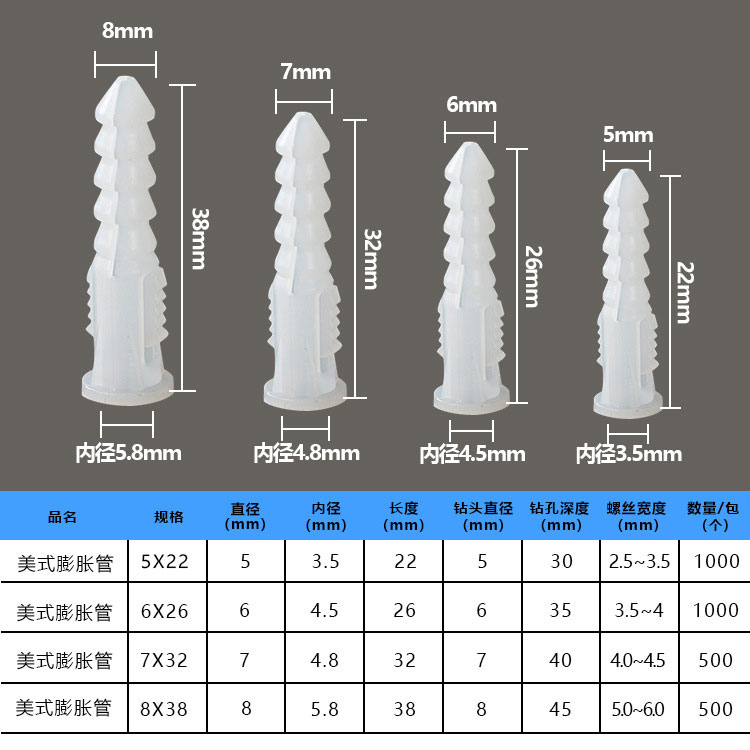 用途:膨胀管与螺丝钉配套使用,可用于电子电器、机器安装、门窗、室外工程施工等等。